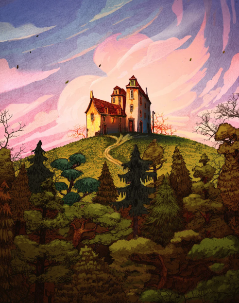 Ilustração de casa antiga numa colina com árvores e céu colorido
