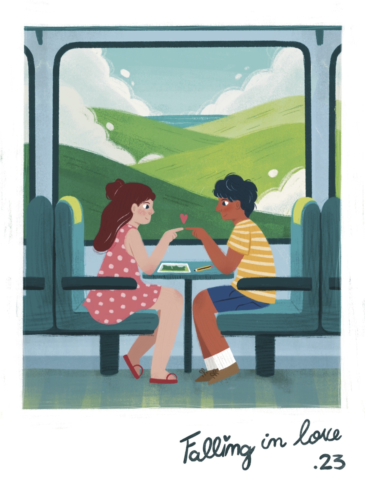 Casal jovem sentado em carruagem de comboio com colinas verdes ao fundo e texto Falling in love .23