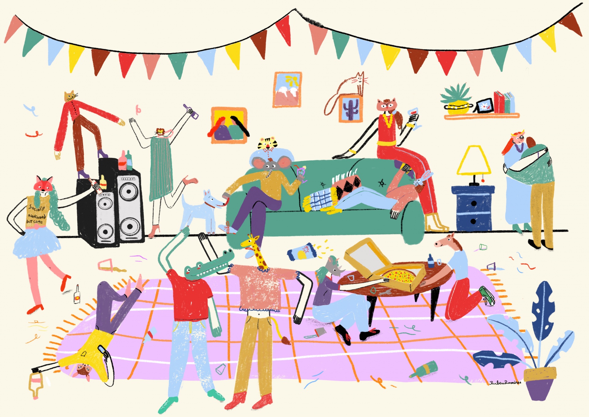 • Ilustração de festa em sala com personagens cartoon, sofá verde, tapete rosa xadrez e pizza sobre mesa