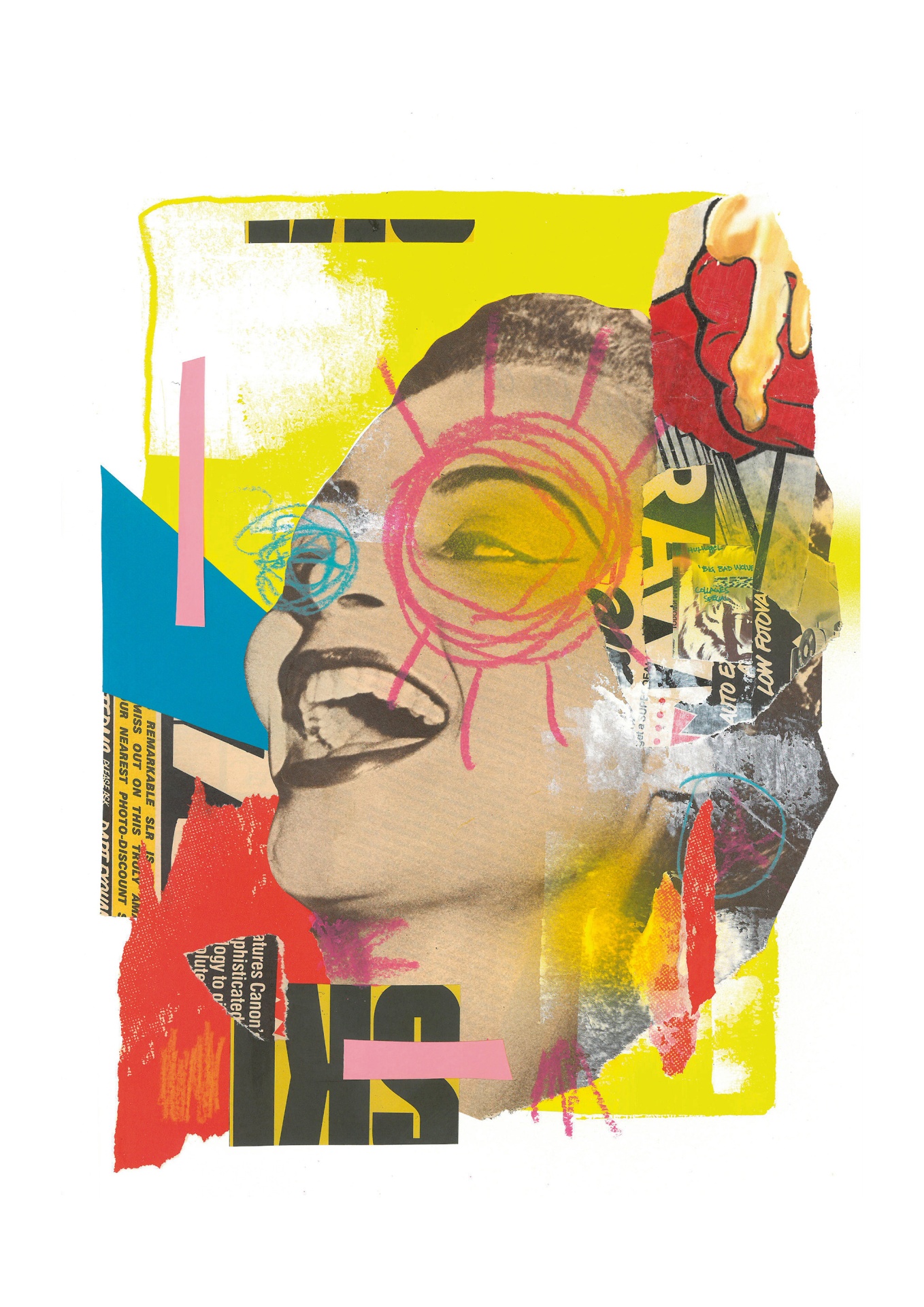 • Arte gráfica com rosto feminino sorridente e elementos coloridos