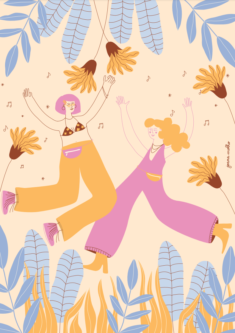 Ilustração de duas mulheres com roupas coloridas entre folhas e flores