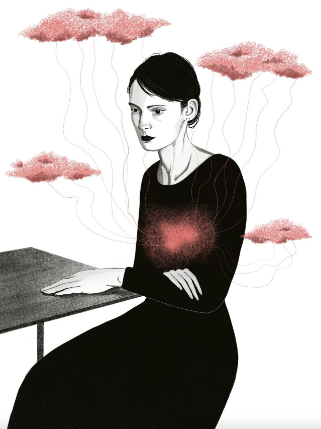 Ilustração de mulher sentada com vestido preto e nuvens cor-de-rosa ligadas ao peito.