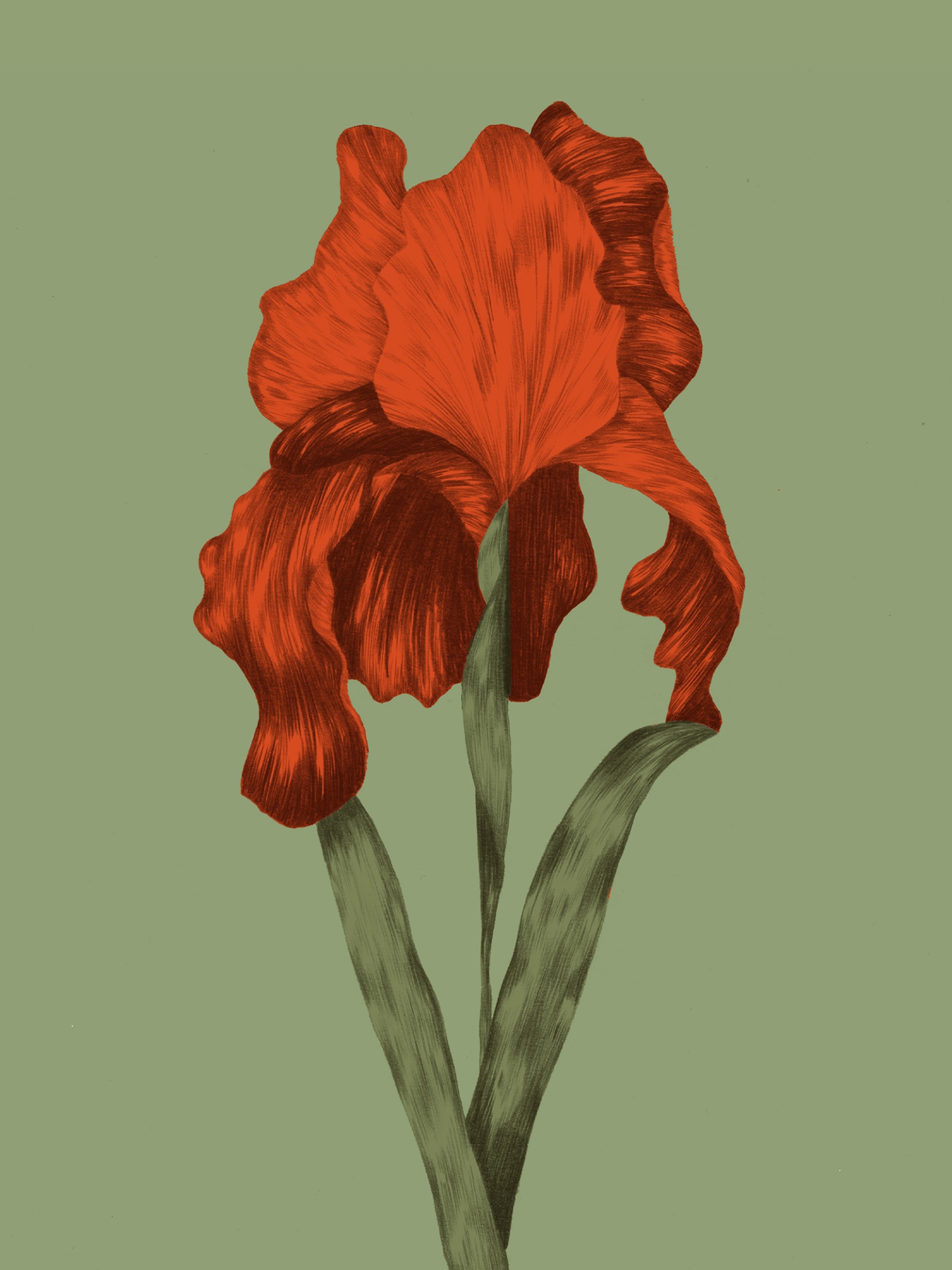Ilustração estilizada de flor iris vermelha com folhas verdes sobre fundo verde-oliva