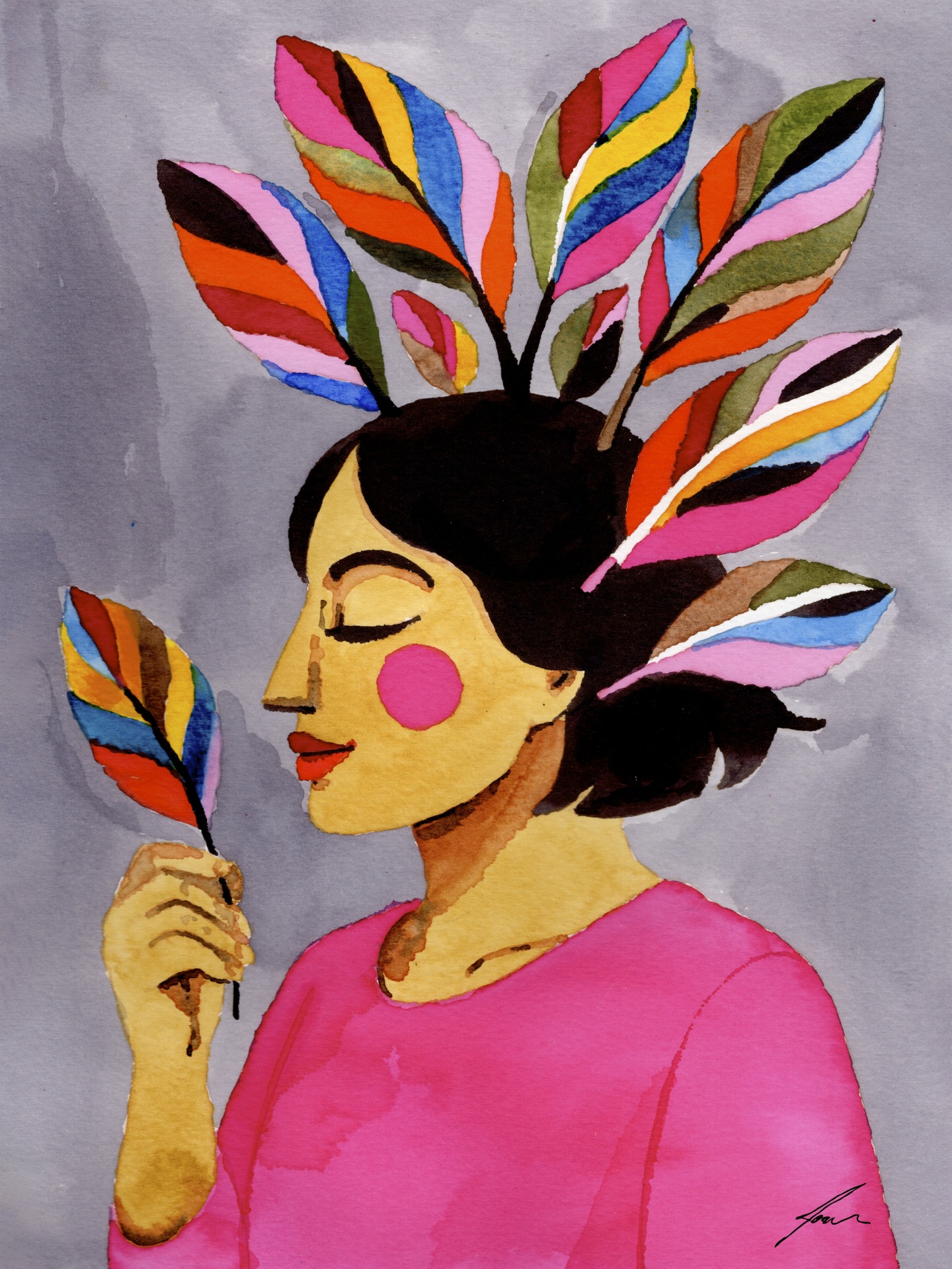 Ilustração de mulher com penas coloridas na cabeça e segurando uma pena, fundo cinzento.