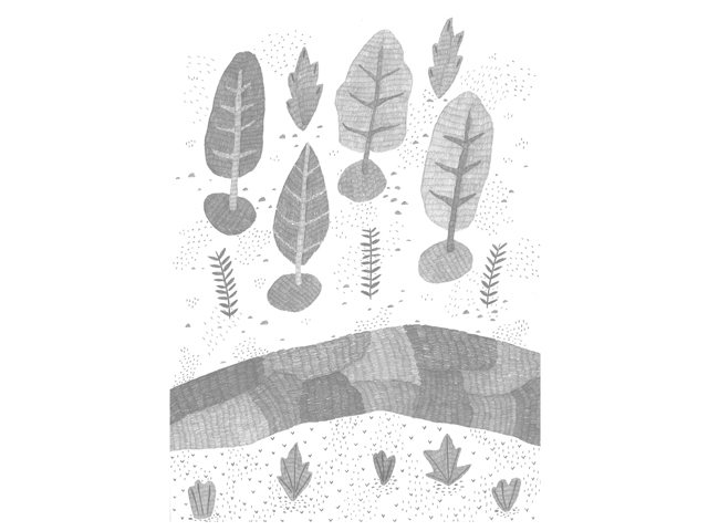 • Ilustração a preto e branco de árvores estilizadas e padrões de fundo