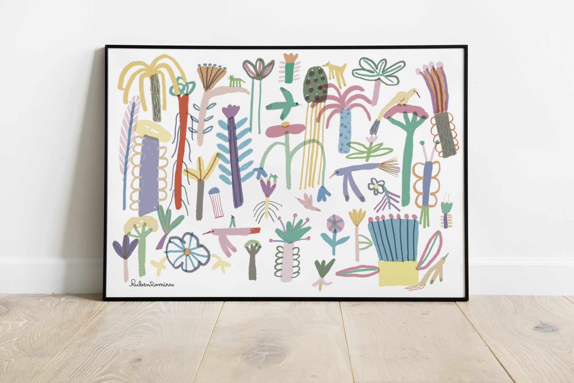 • Quadro ilustrativo colorido de plantas e flores estilizadas