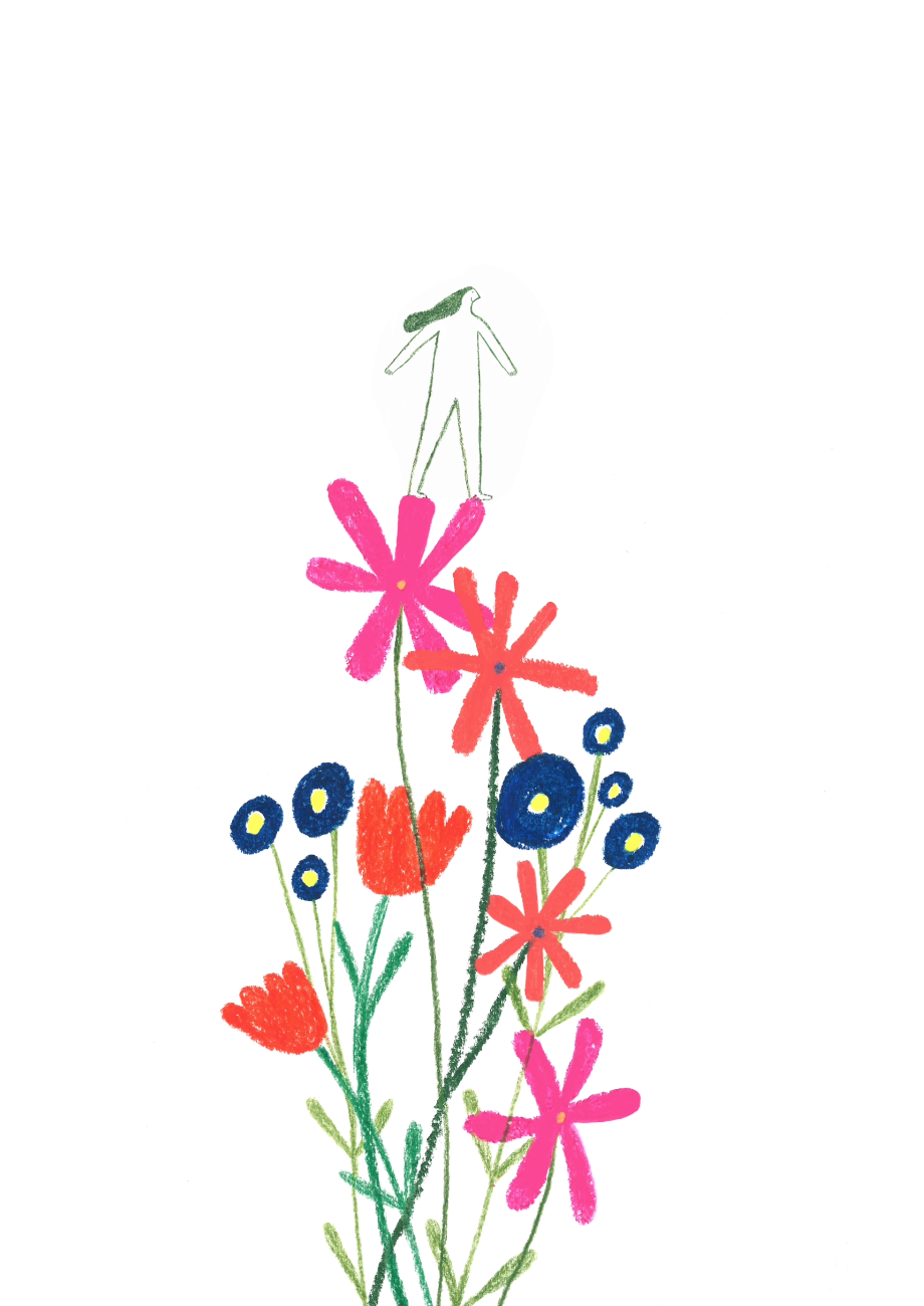 • Desenho colorido de flores com um boneco sentado no topo.