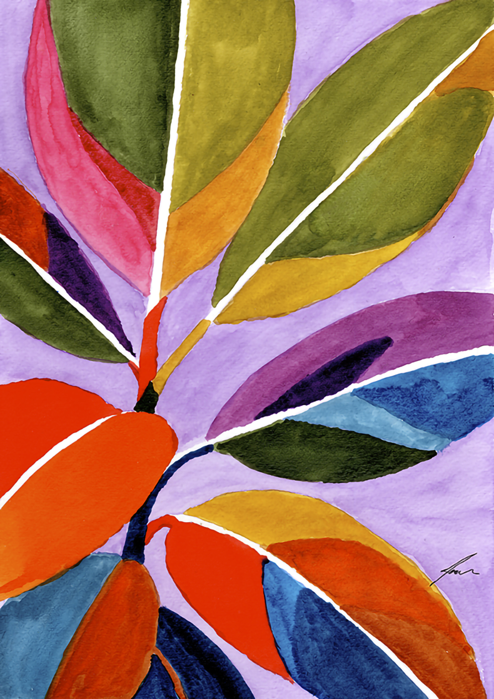 Pintura abstrata colorida com folhas largas em várias cores sobre fundo lilás
