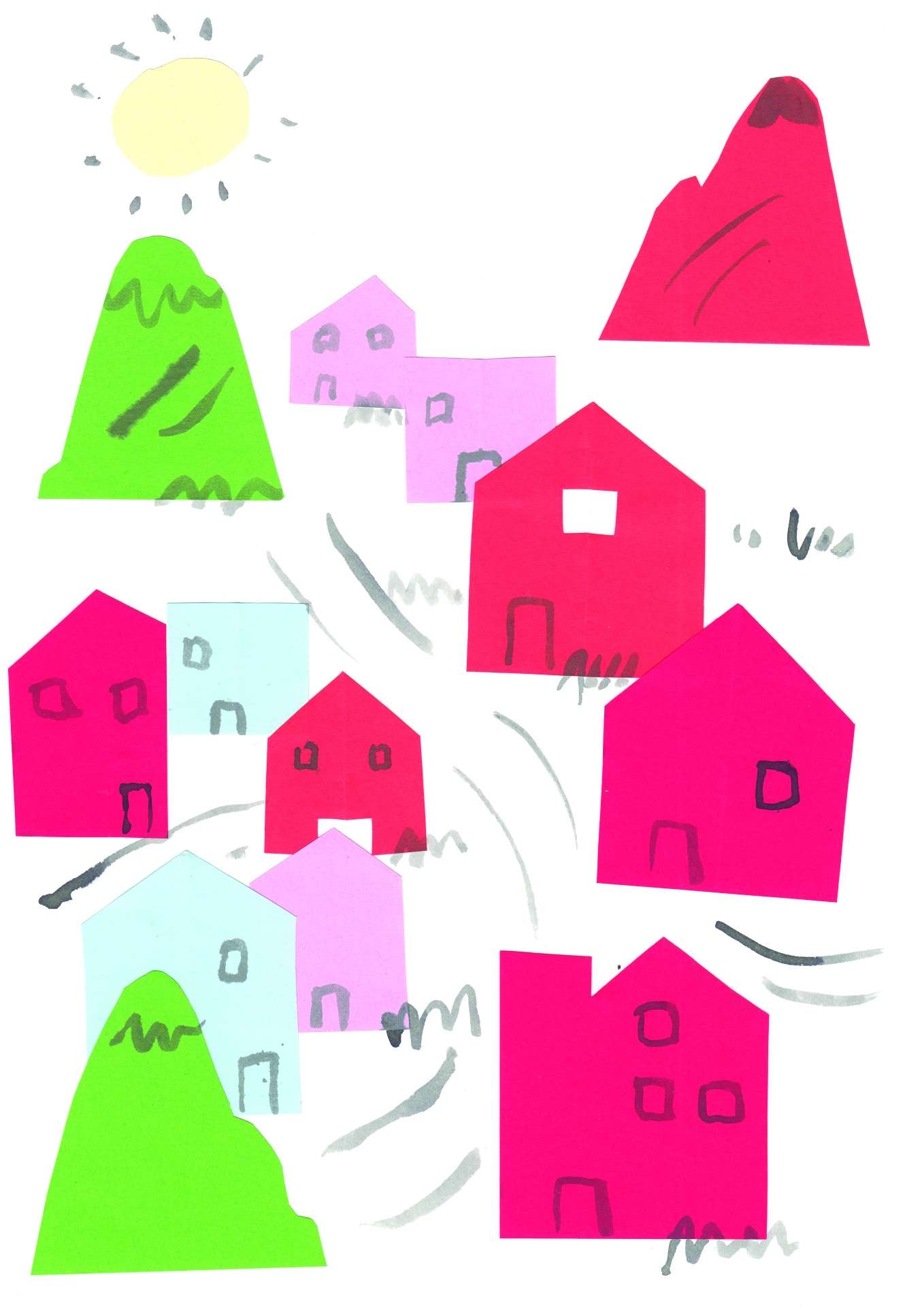 • Desenho colorido de casas e montanhas com sol