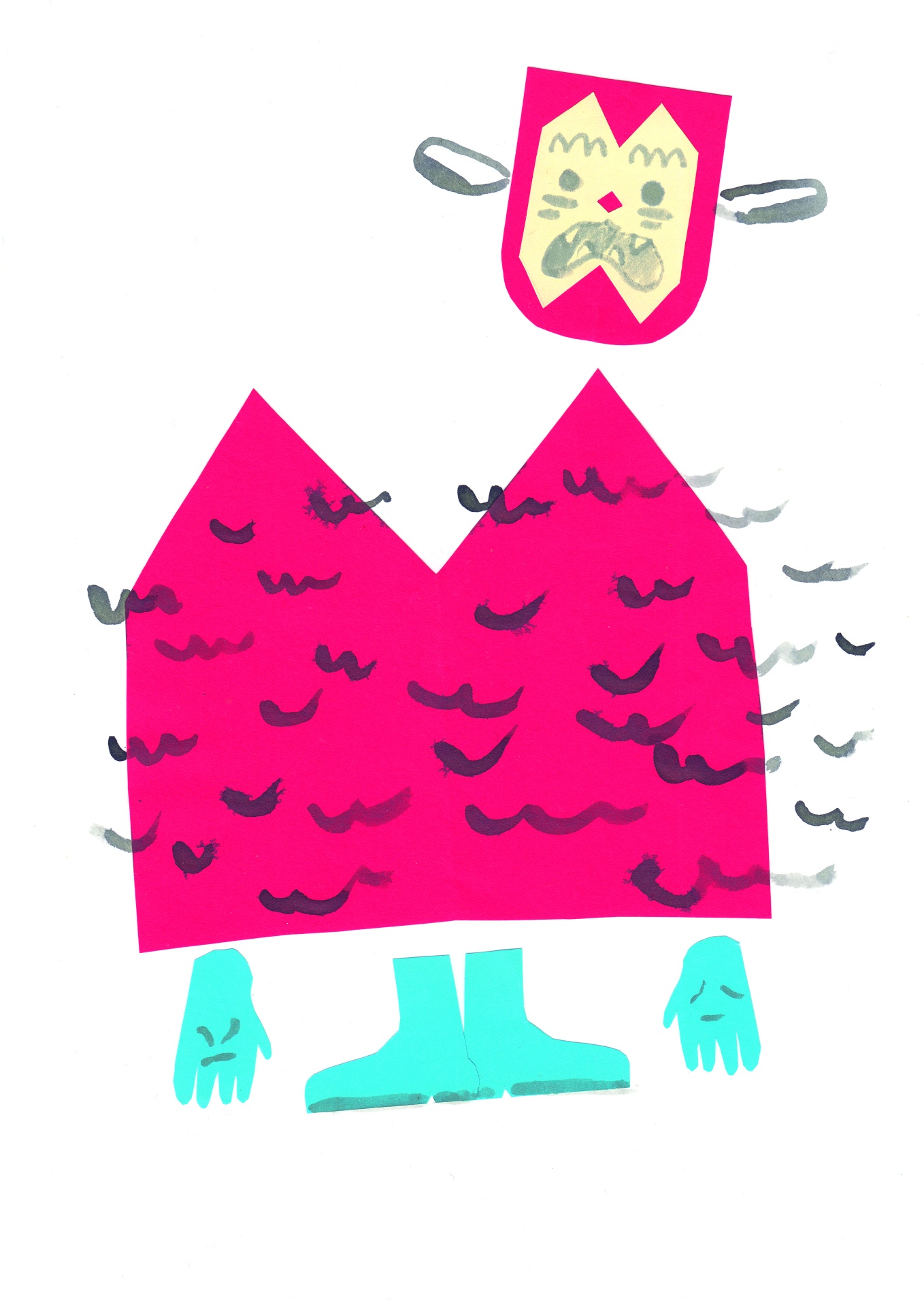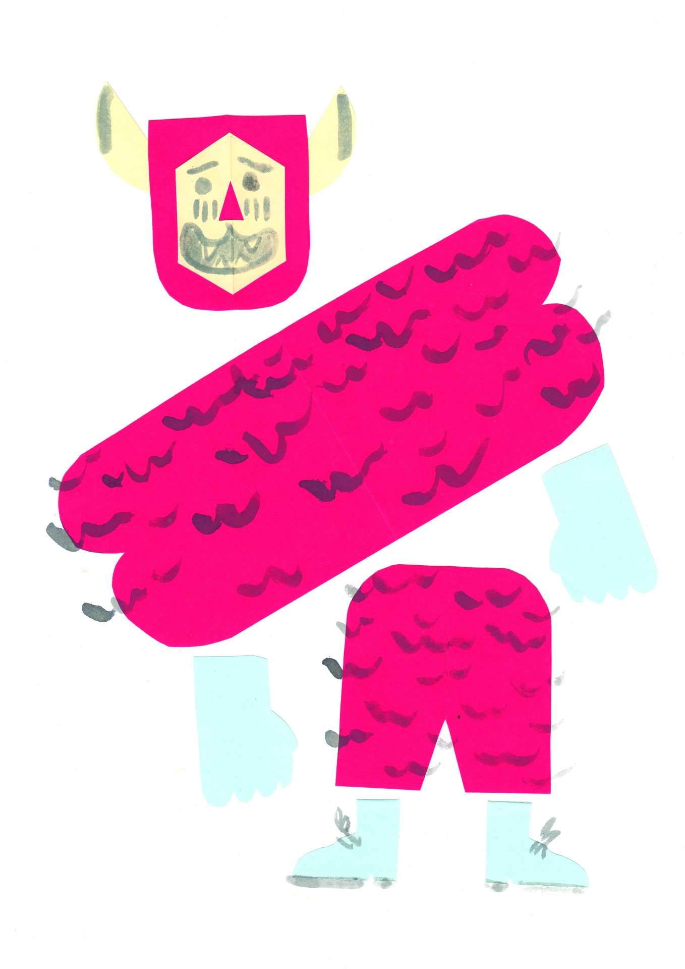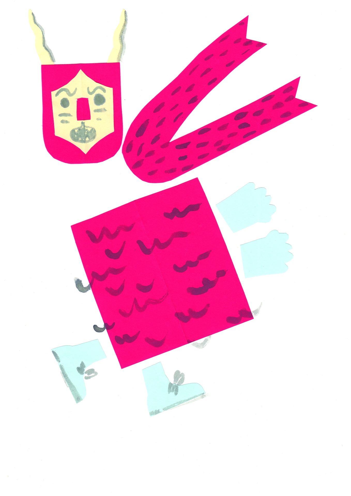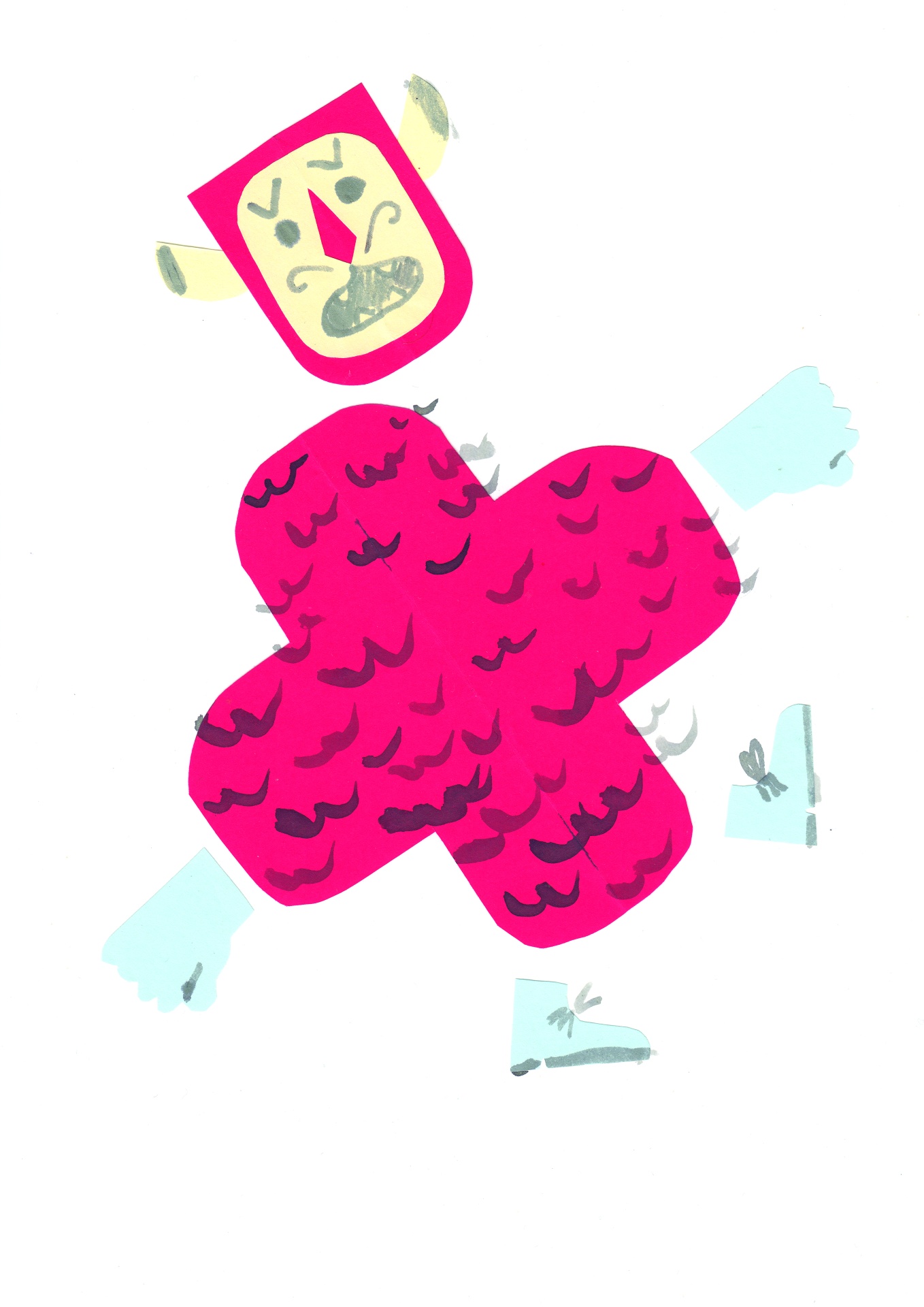 • ilustração personagem papel recortado com cores rosa, amarelo, azul e manchas pretas