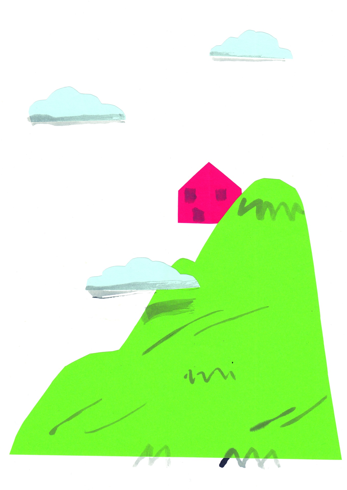 • Desenho colorido de colina verde com casinha vermelha e nuvens azuis