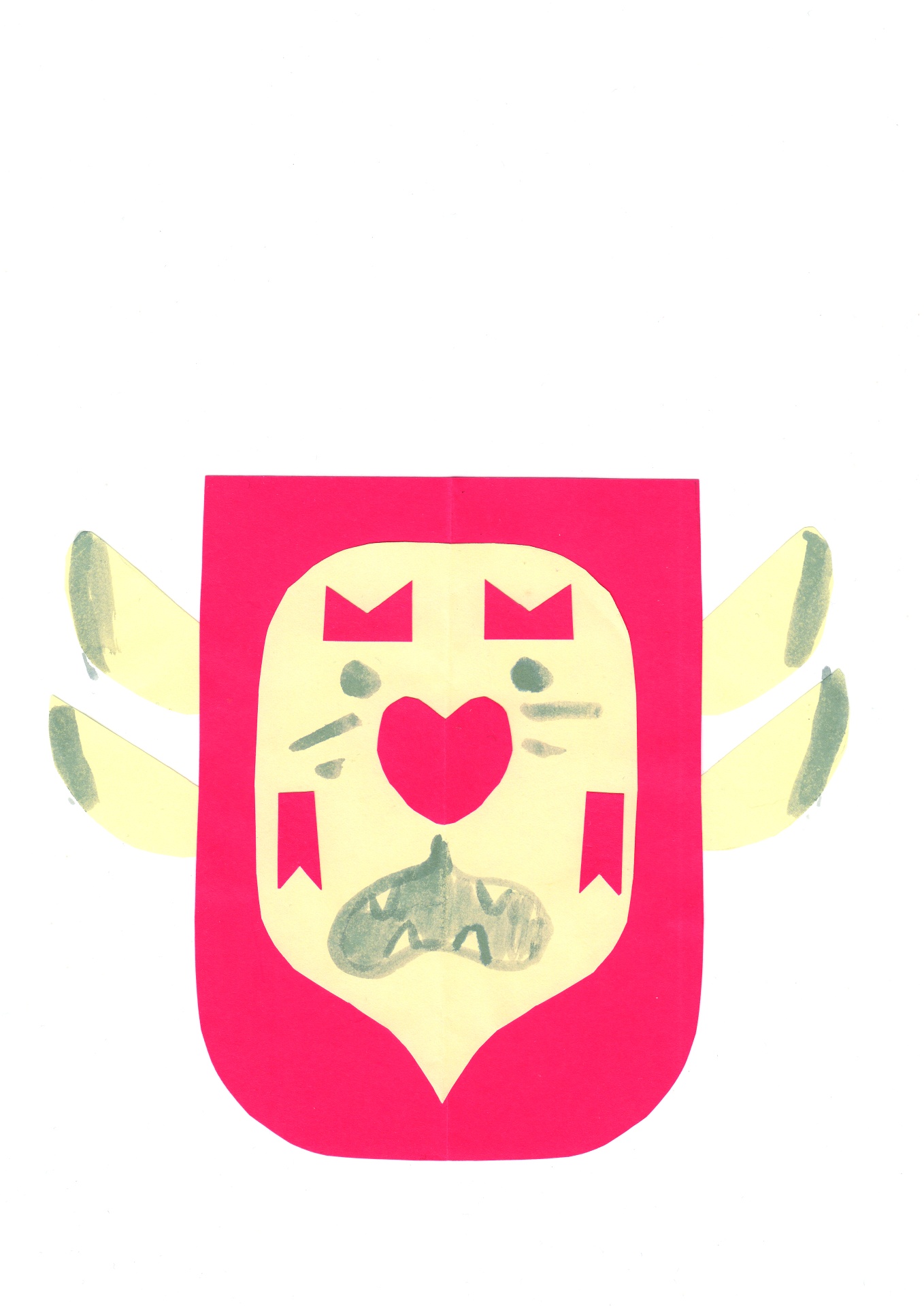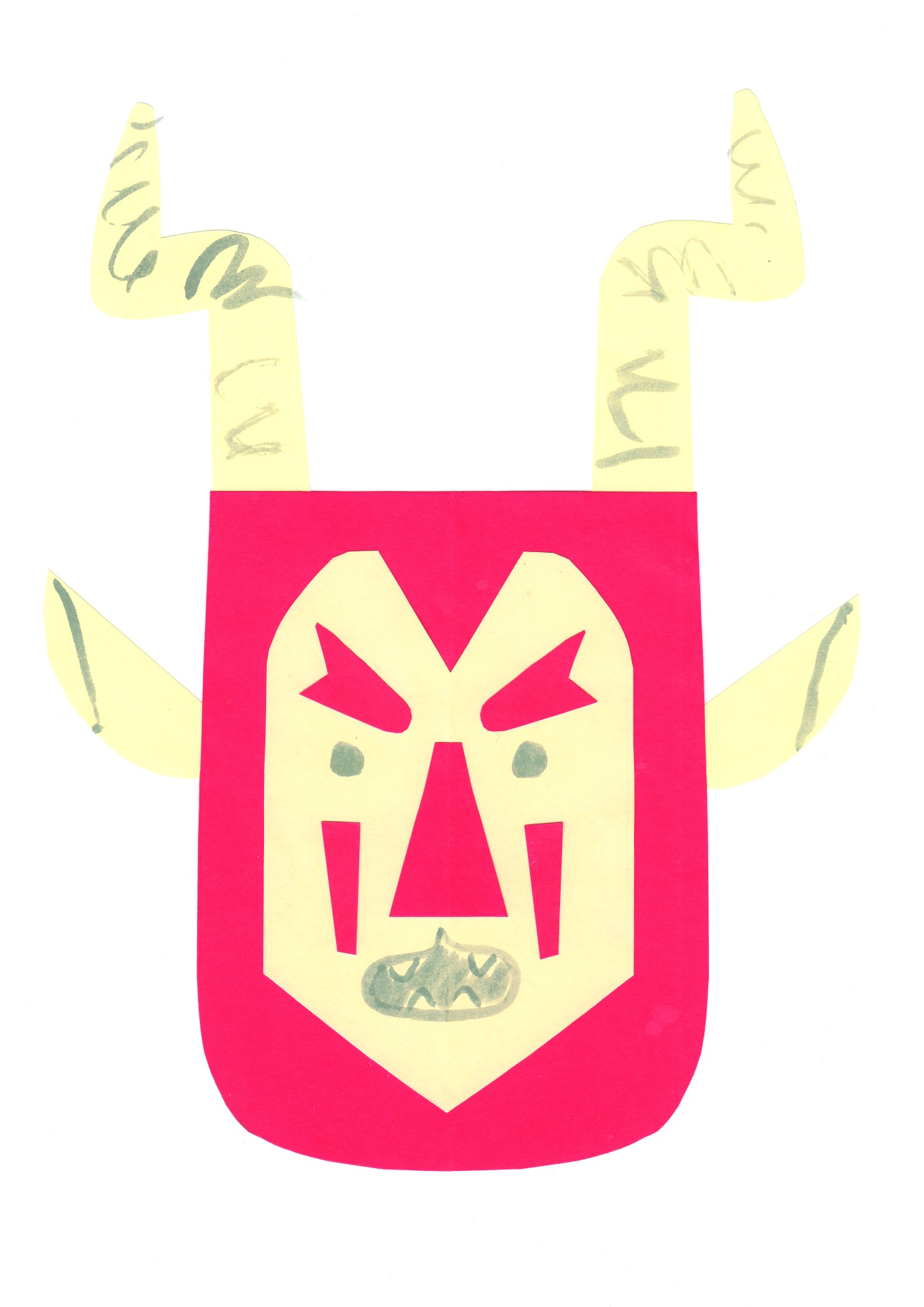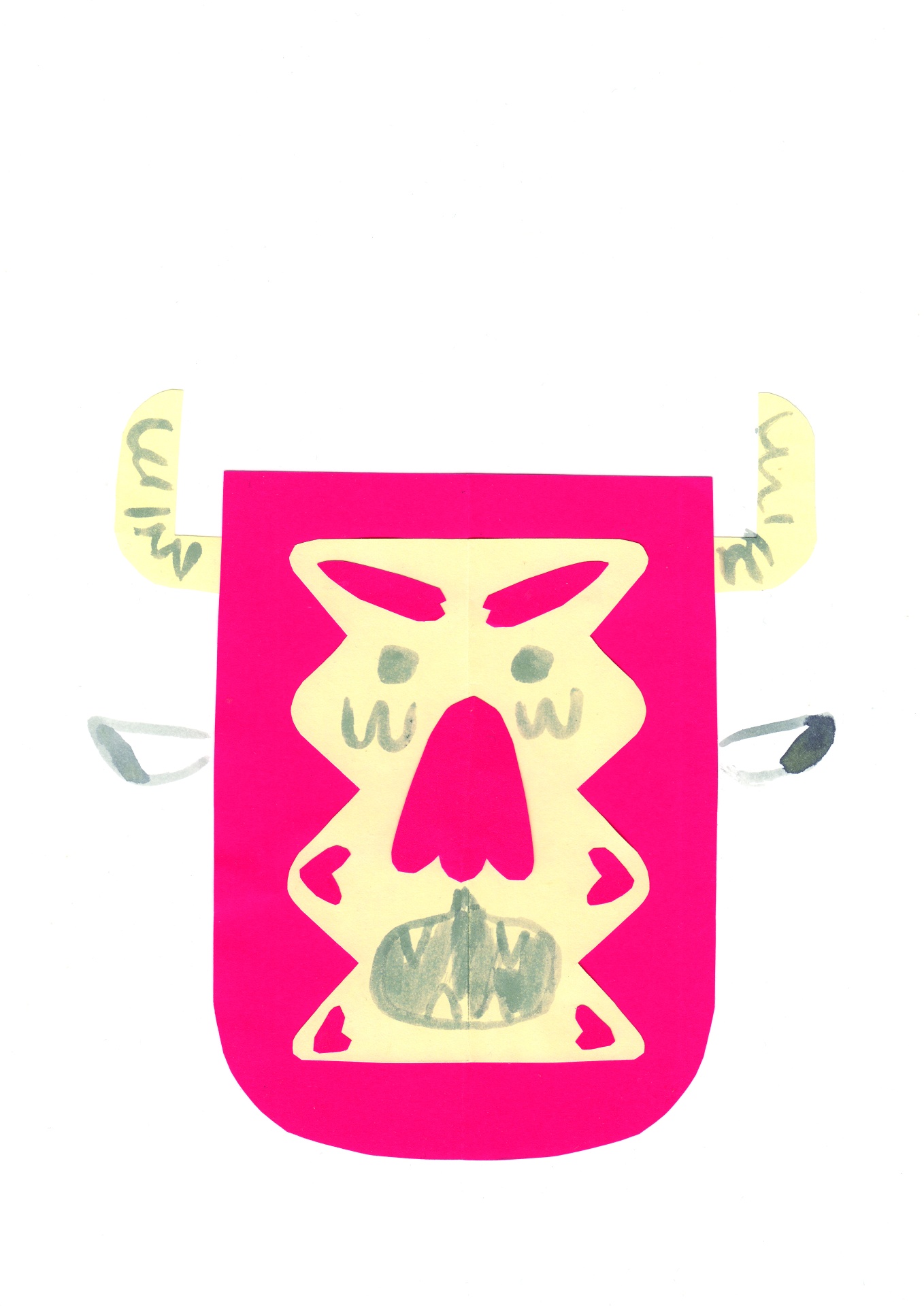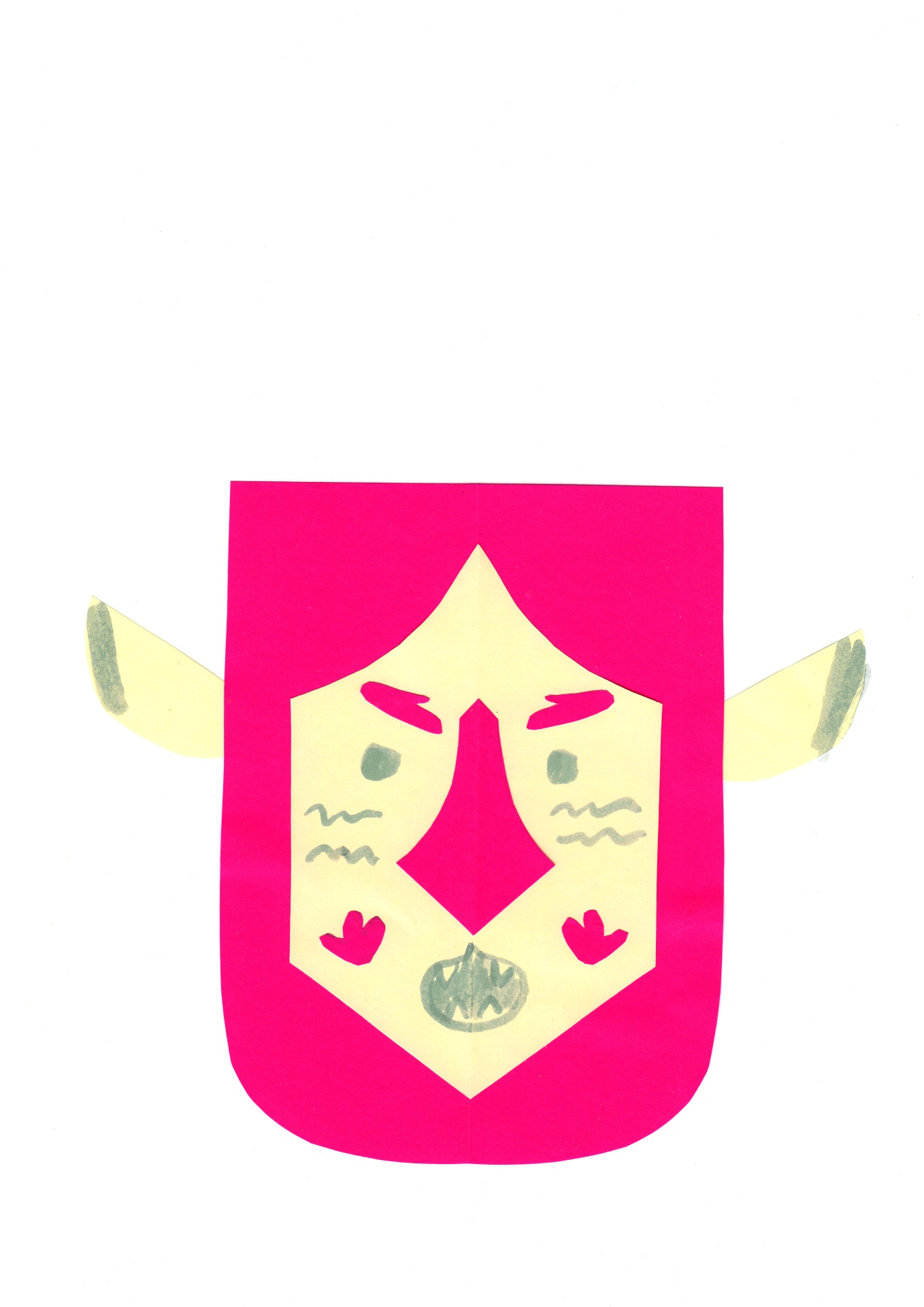 • máscara de papel recortado com rosto estilizado e cores amarelo, rosa e cinzento