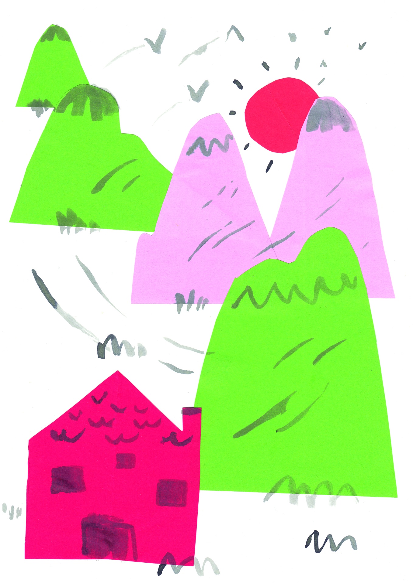 • Desenho gráfico colorido de montanhas e uma casa abstrata.