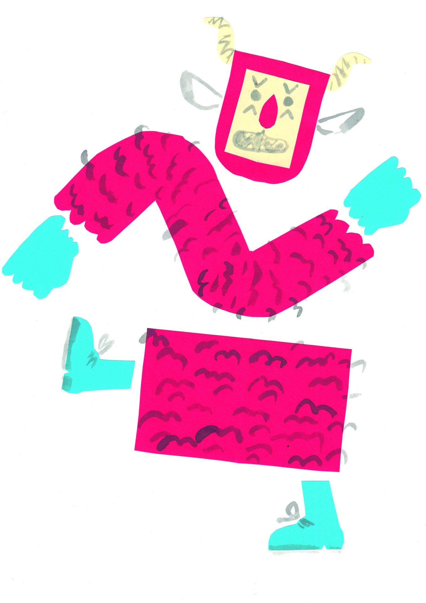 • Desenho colorido de um monstro com braços e corpo cor-de-rosa, mãos e pés azuis, rosto amarelo com chifres e feições desenhadas.