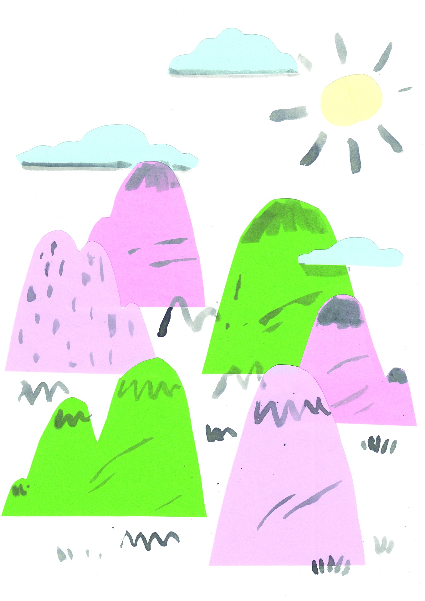 • Desenho colorido de montanhas, nuvens e sol.