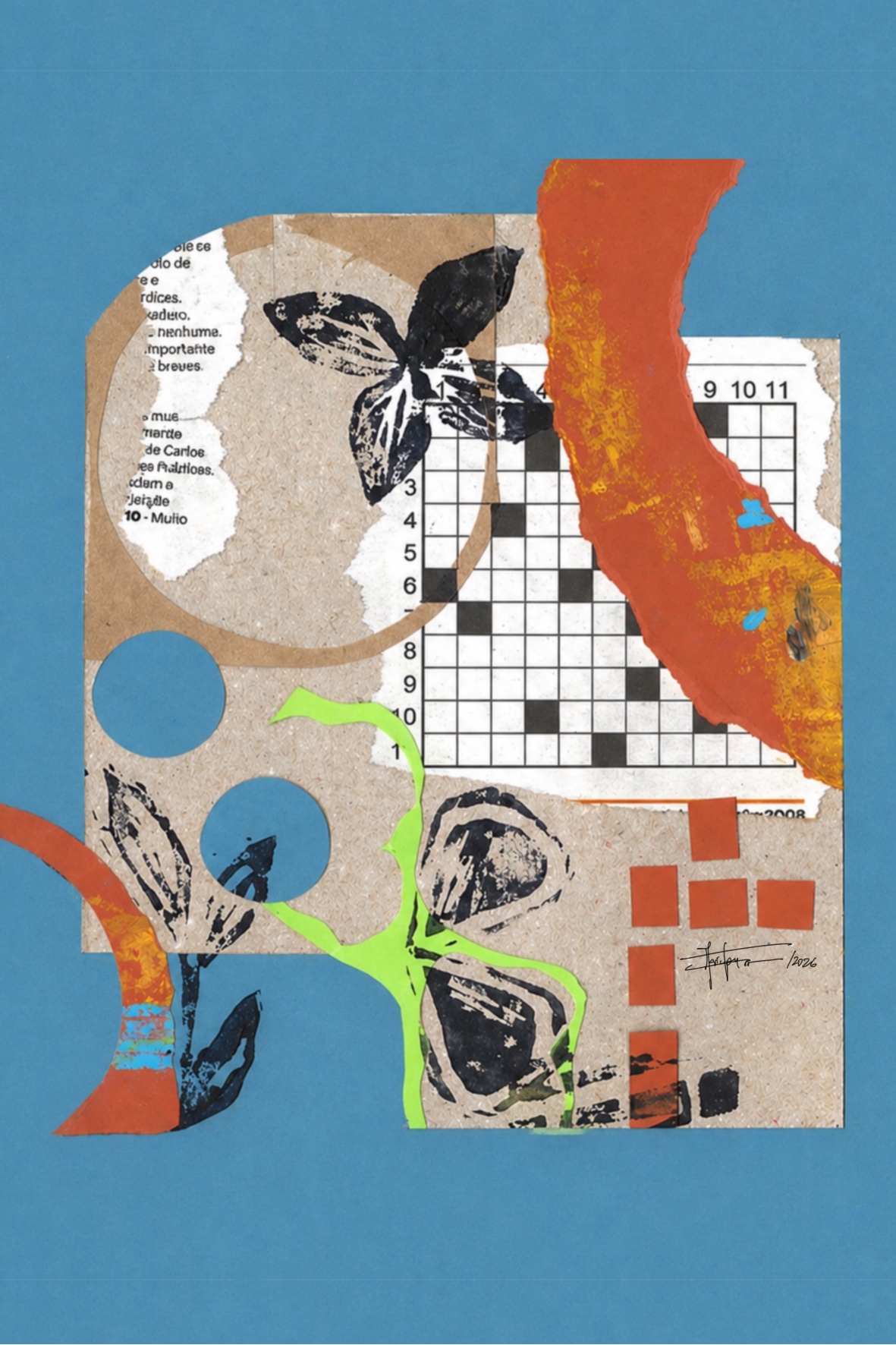 Obra em técnica mista que explora a relação entre estrutura e espontaneidade através da sobreposição de formas orgânicas, elementos geométricos e fragmentos gráficos.