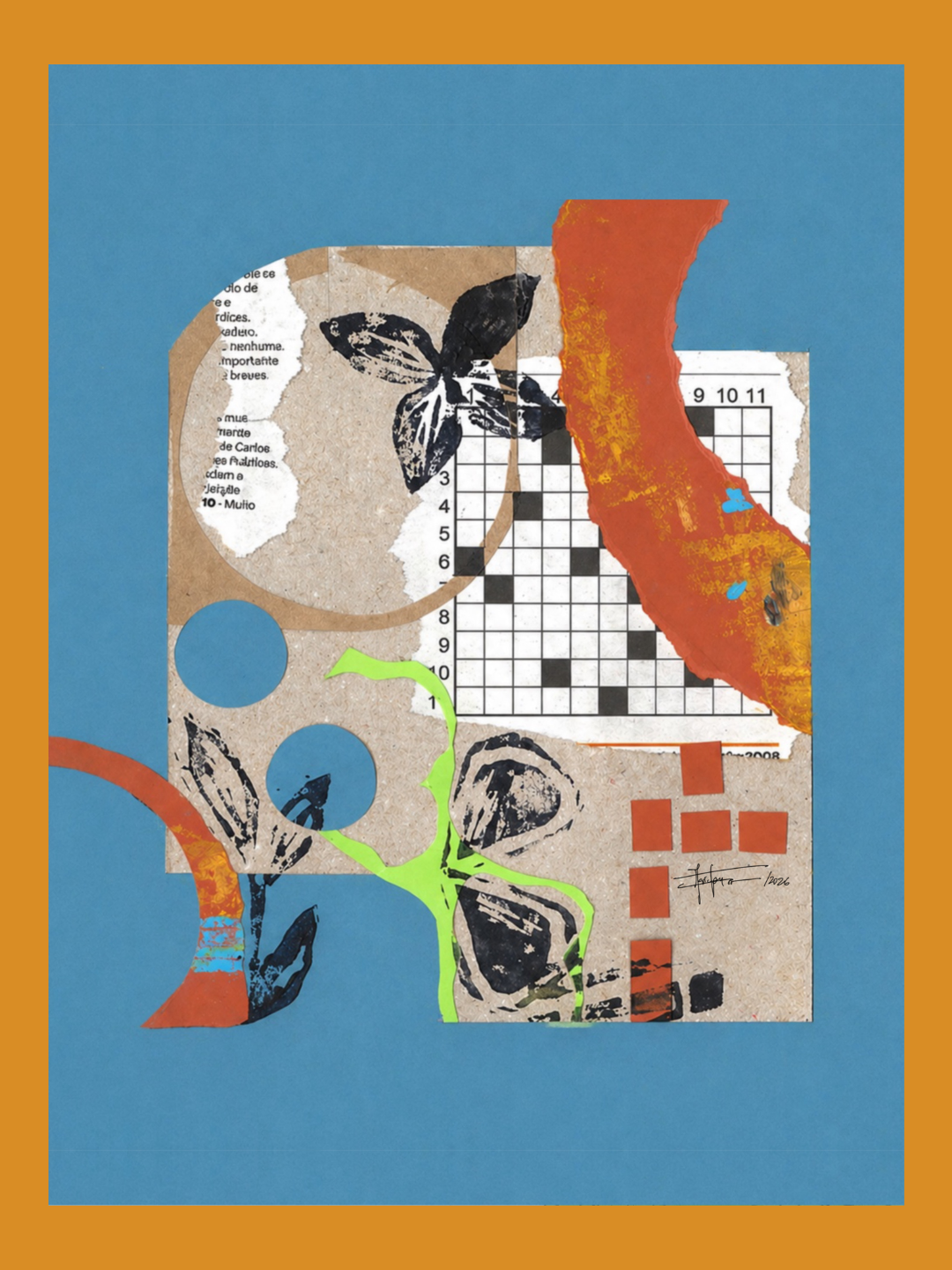 Obra em técnica mista que explora a relação entre estrutura e espontaneidade através da sobreposição de formas orgânicas, elementos geométricos e fragmentos gráficos.