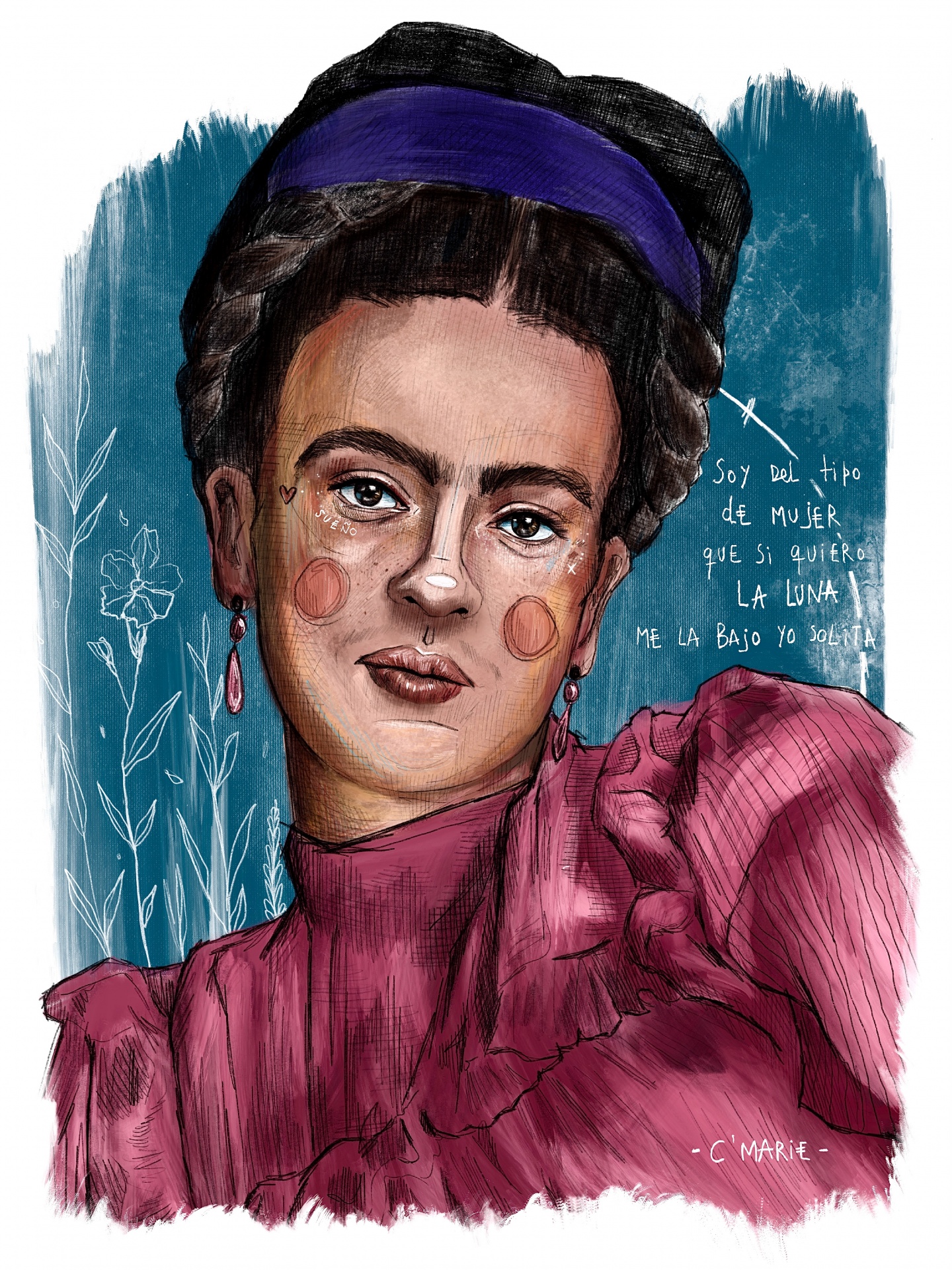 • Retrato digital de mulher com faixa azul e blusa rosa, fundo azul com flores e texto manuscrito