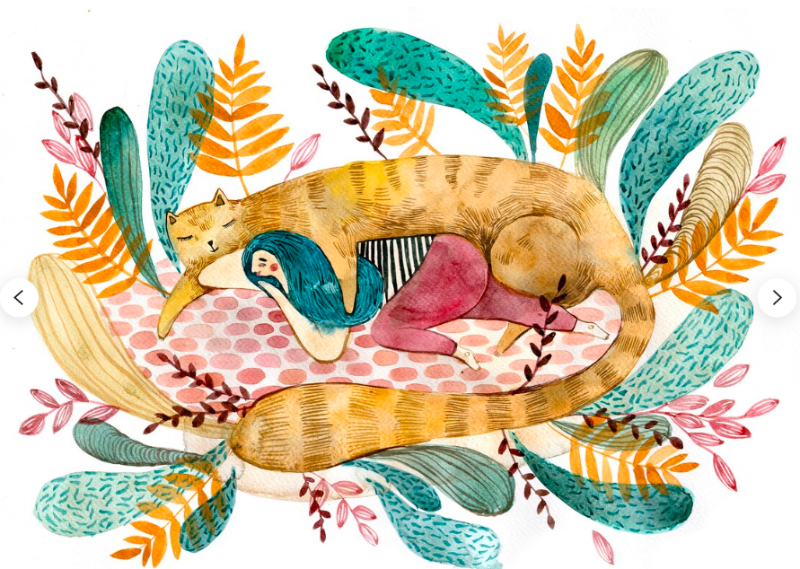 Ilustração com gata laranja abraçando figura humana rodeada de folhas coloridas