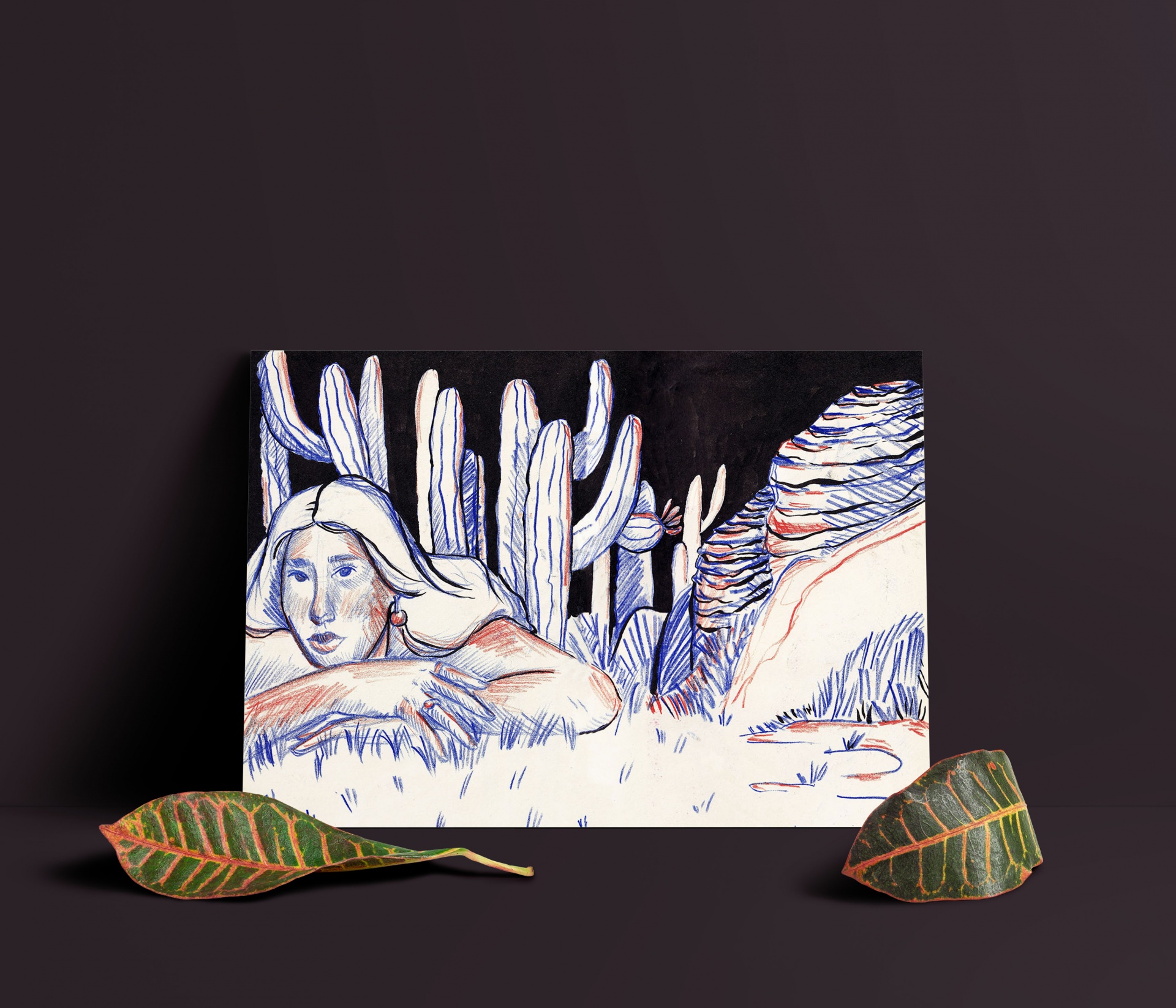 Ilustração a tinta de figura feminina com cactos e rochas em cartão sobre fundo preto com duas folhas secas
