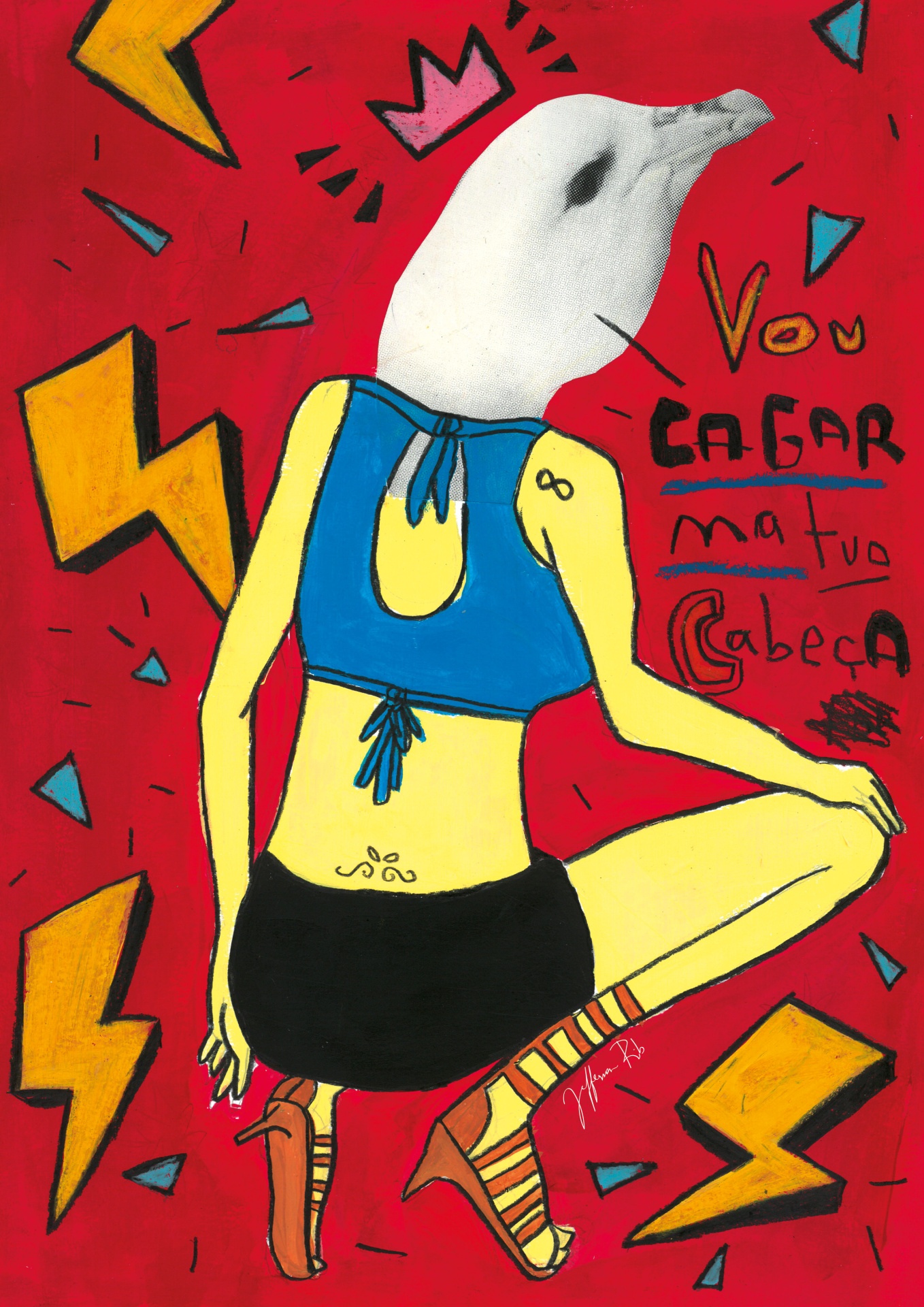 Ilustração de figura com corpo amarelo e cabeça de gaivota num fundo vermelho com relâmpagos e texto