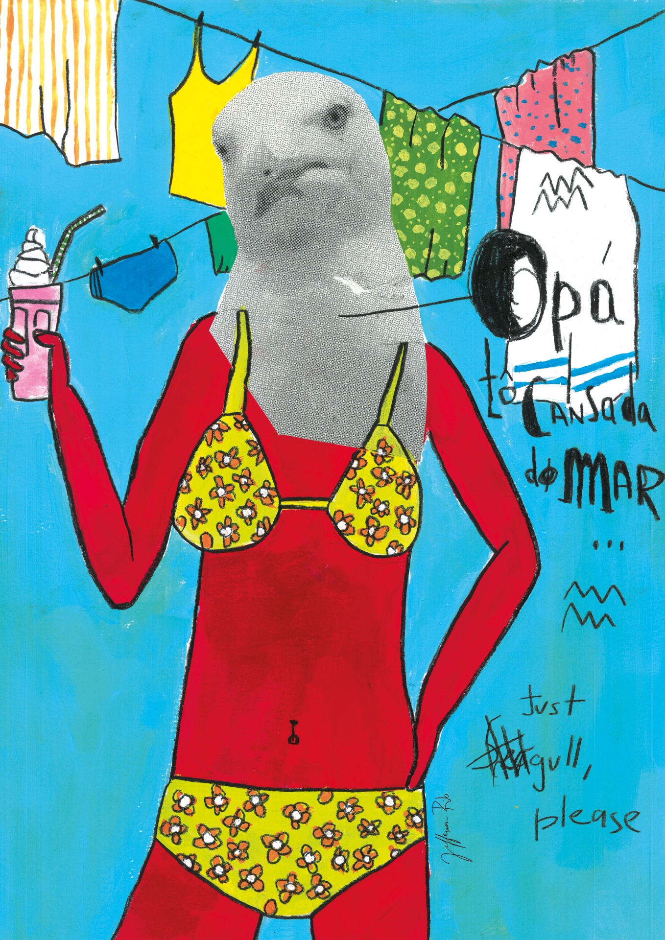 Ilustração de figura de bikini amarelo com cabeça de gaivota em ambiente de roupa estendida e fundo azul