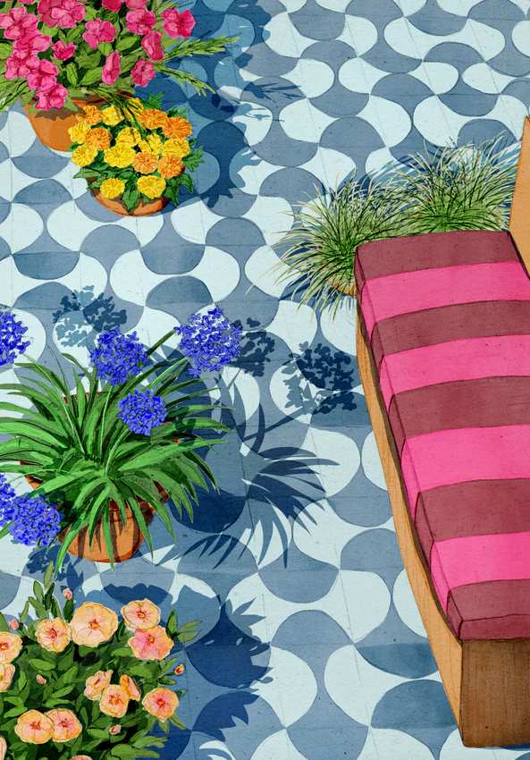 • Pátio com azulejos azuis e cinzentos, vasos de flores e espreguiçadeira de madeira com almofada listrada