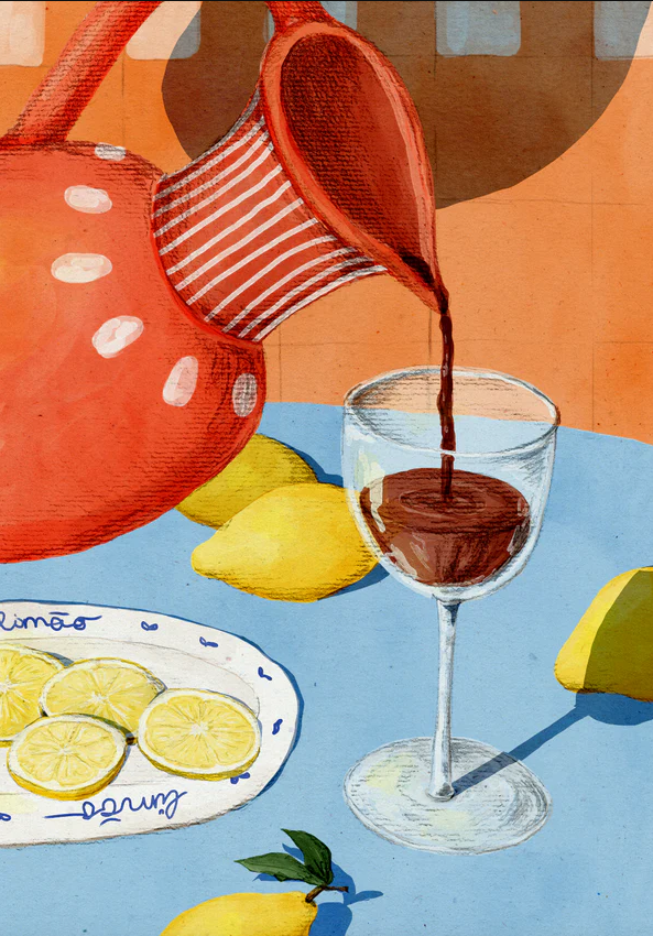 • Jarro vermelho a verter líquido castanho em copo de vidro, limões e prato com fatias de limão numa mesa azul.