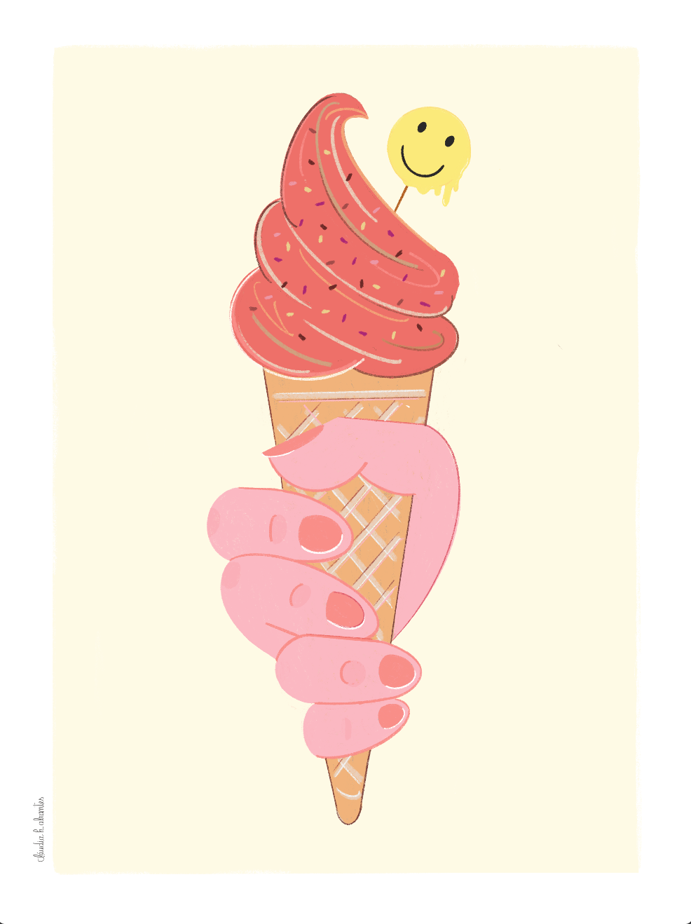 • Ilustração de mão segurando cone de gelado com carinha sorridente