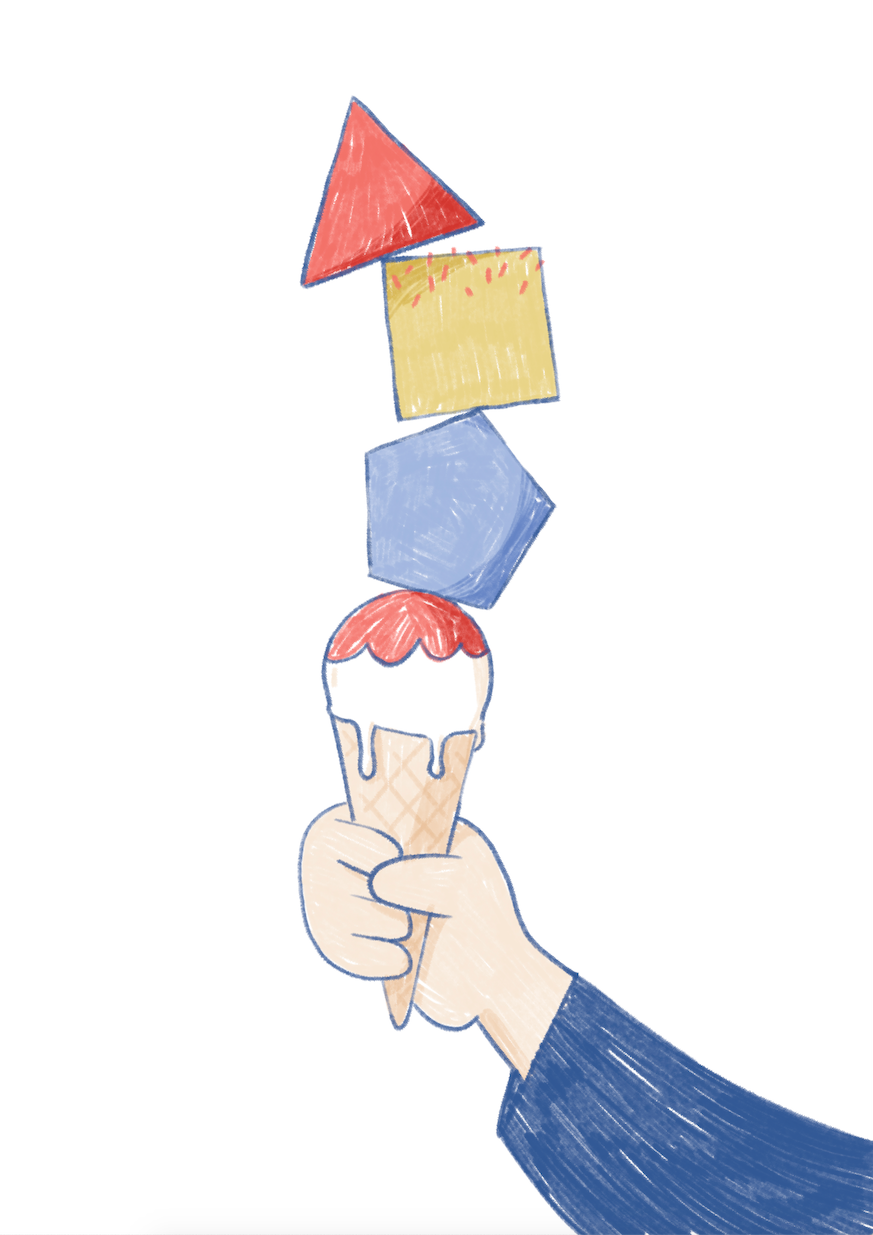 Mão a segurar um gelado em cone com formas geométricas coloridas acima