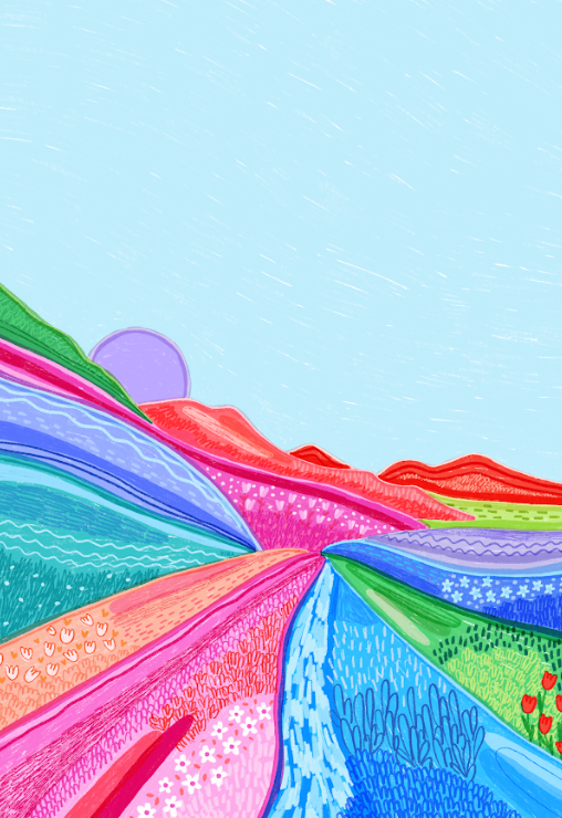 Ilustração colorida de um campo com colinas e flores em várias cores