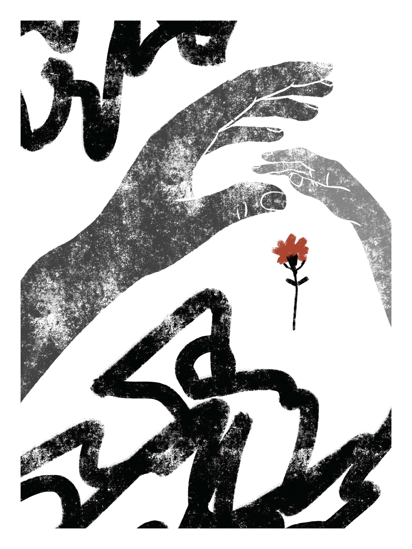 Duas mãos cinzentas e uma pequena flor vermelha sobre fundo branco com elementos pretos abstratos.