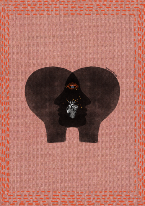 • Obra de arte digital com silhuetas negras sobrepostas e coração anatómico no centro