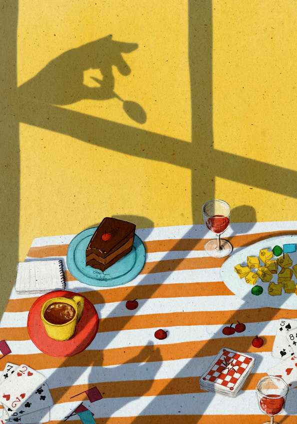 • Mesa com chávena, bolo, cartas e sombra de mão com colher
