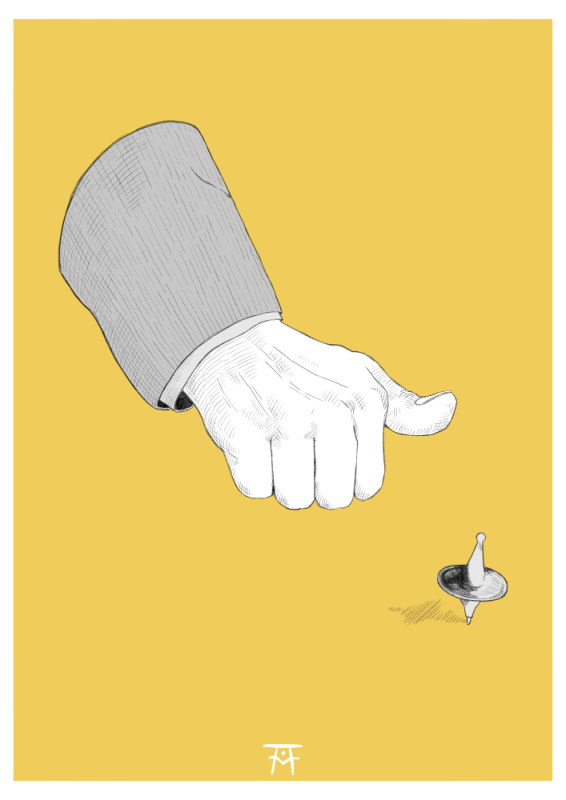 Ilustração de mão com gesto de polegar para cima e pião girando em fundo amarelo