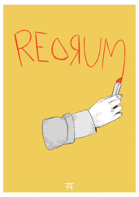 • Desenho de um braço segurando batom vermelho que escreve REDRUM em fundo amarelo
