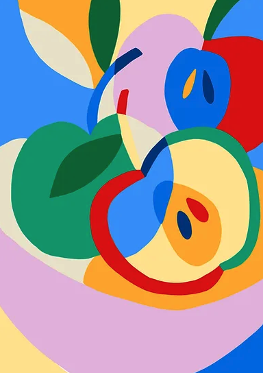 • Ilustração digital colorida de dois pêssegos abstratos em formas e cores vibrantes.