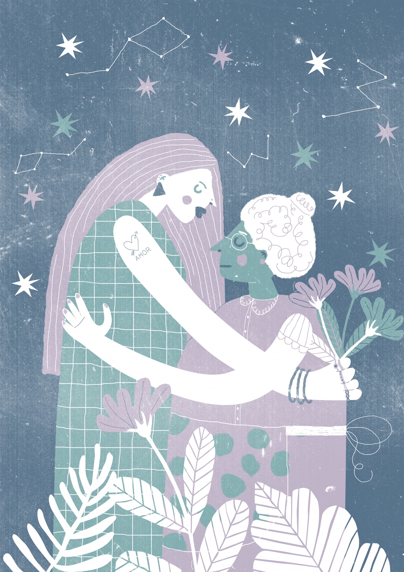 • Ilustração digital de duas pessoas abraçadas com fundo de constelações e plantas