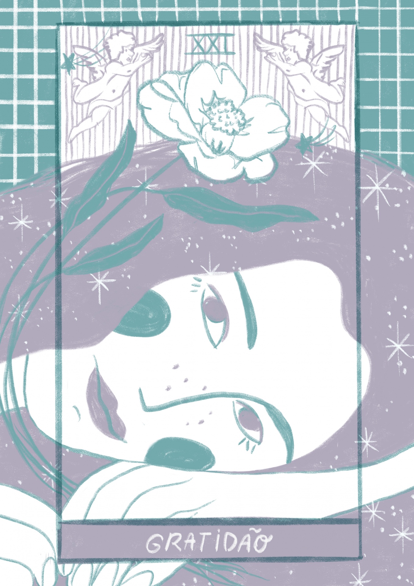 • Cartão ilustrado com mulher, anjos, flor e texto 'GRATIDÃO'.