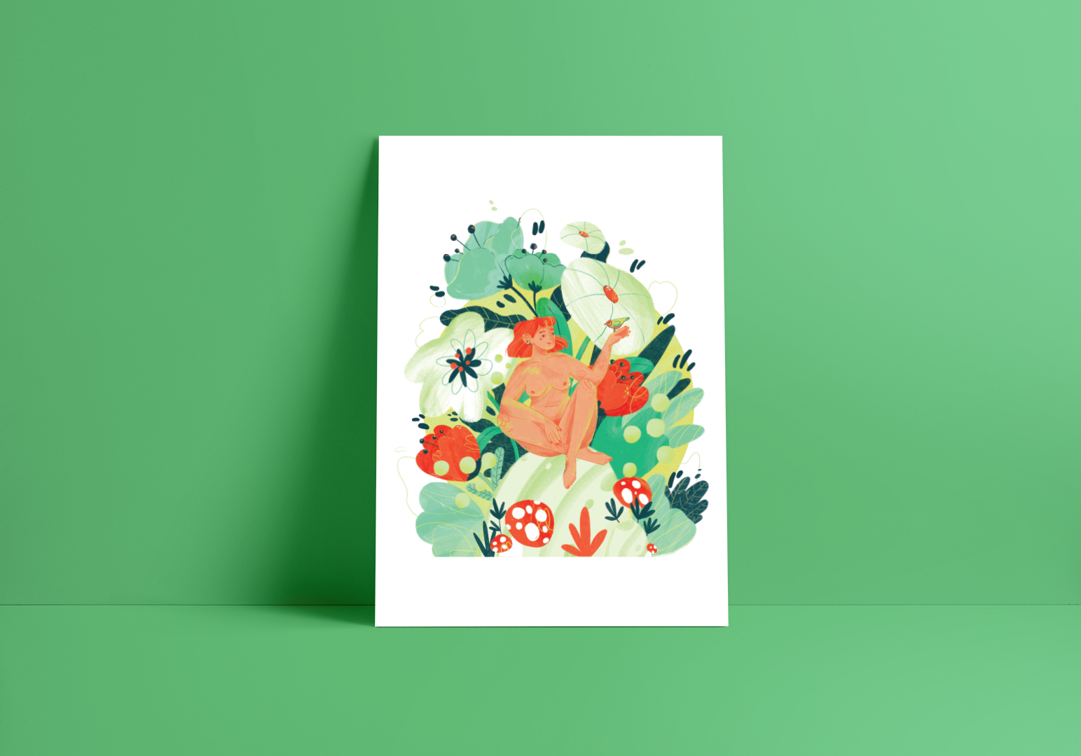 • Cartaz ilustrado com figura humana e elementos botânicos sobre fundo branco, apoiado em superfície verde.
