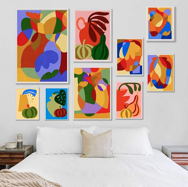 • Conjunto de oito quadros abstratos coloridos com motivos de abóboras na parede acima de cama branca