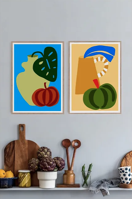 • Dois quadros abstratos coloridos pendurados numa parede cinzenta acima de prateleira com objetos de cozinha e plantas