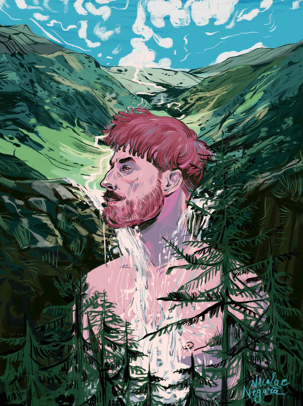 Ilustração artística de homem com cabelo e barba ruiva entre natureza e cascata