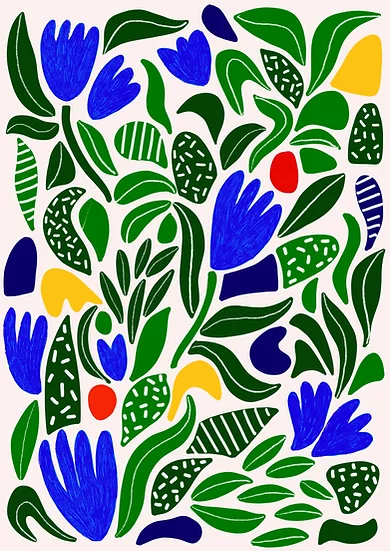 • Padrão abstrato colorido com flores e folhas em azul, verde, amarelo, vermelho e azul escuro
