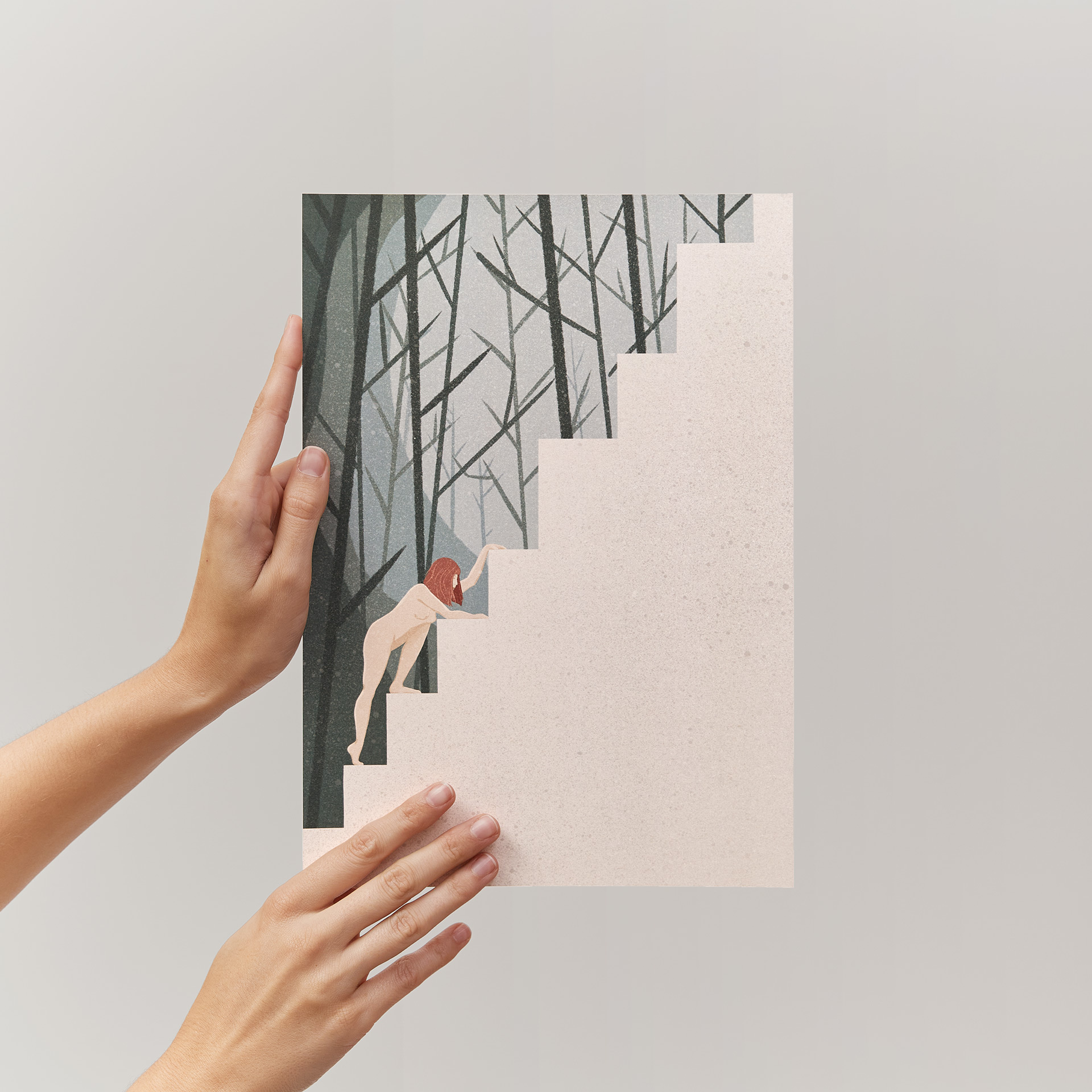 • Capa de livro com ilustração de figura humana a subir escadas brancas e fundo de árvores estilizadas.
