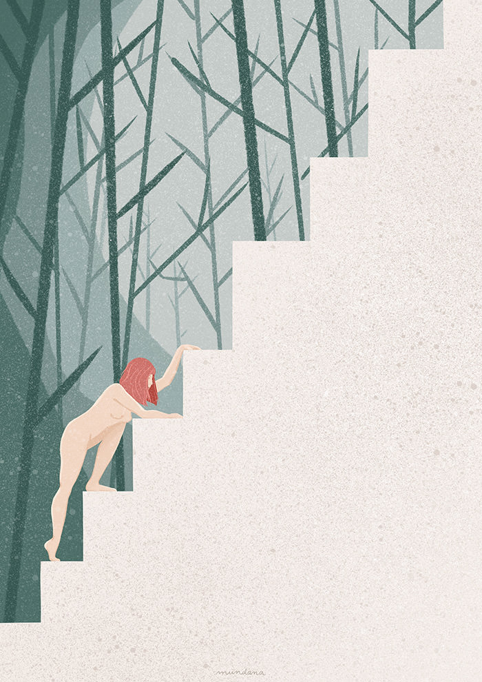 • Mulher nua a subir degraus grandes brancos com fundo de árvores sem folhas