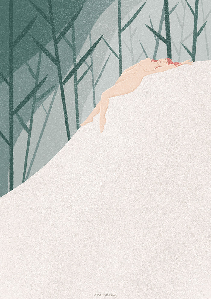 • Ilustração digital de figura humana nua repousando numa colina branca com árvores verdes ao fundo