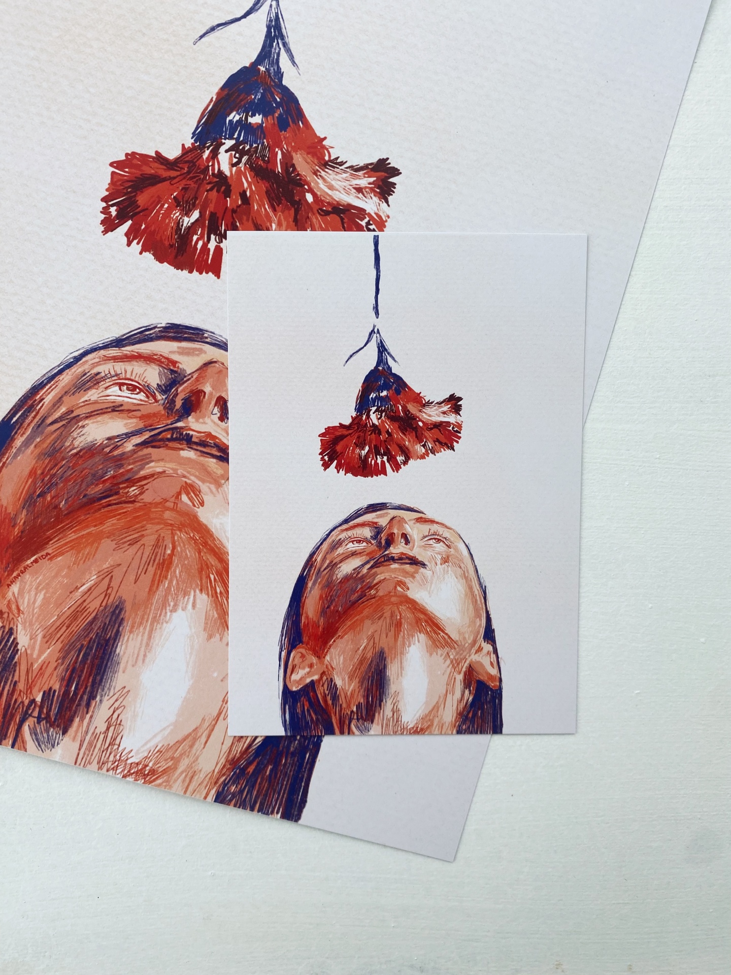 • Ilustrações em papel com rosto de pessoa e flor pendurada em tons vermelhos e azul escuro