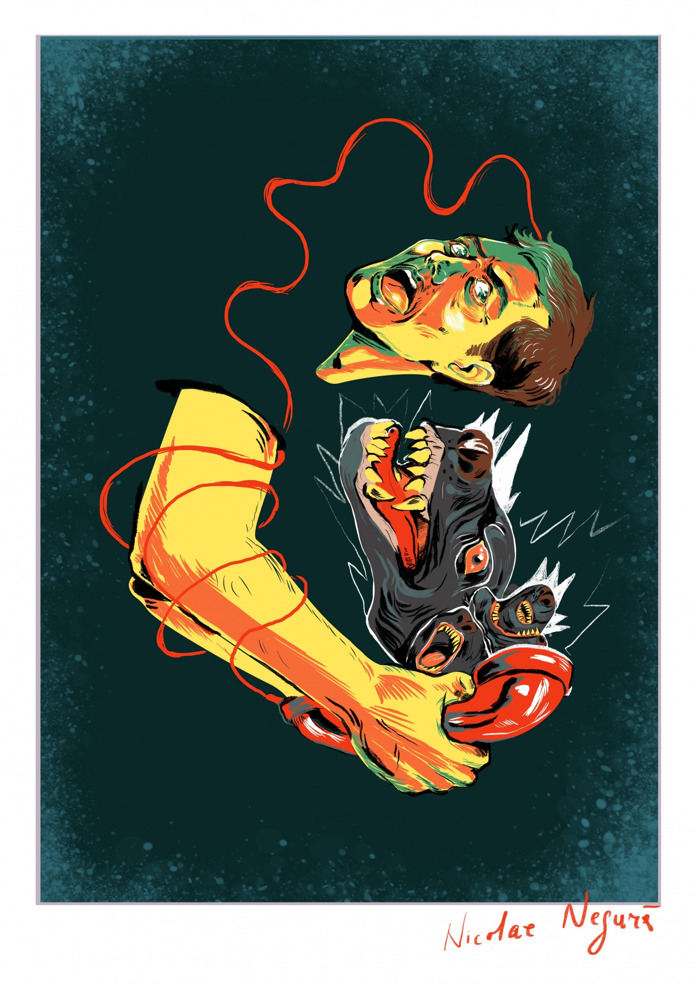 • Ilustração digital de braço amarelo segurando cabeça humana e cabeça de cão feroz, com cordão vermelho
