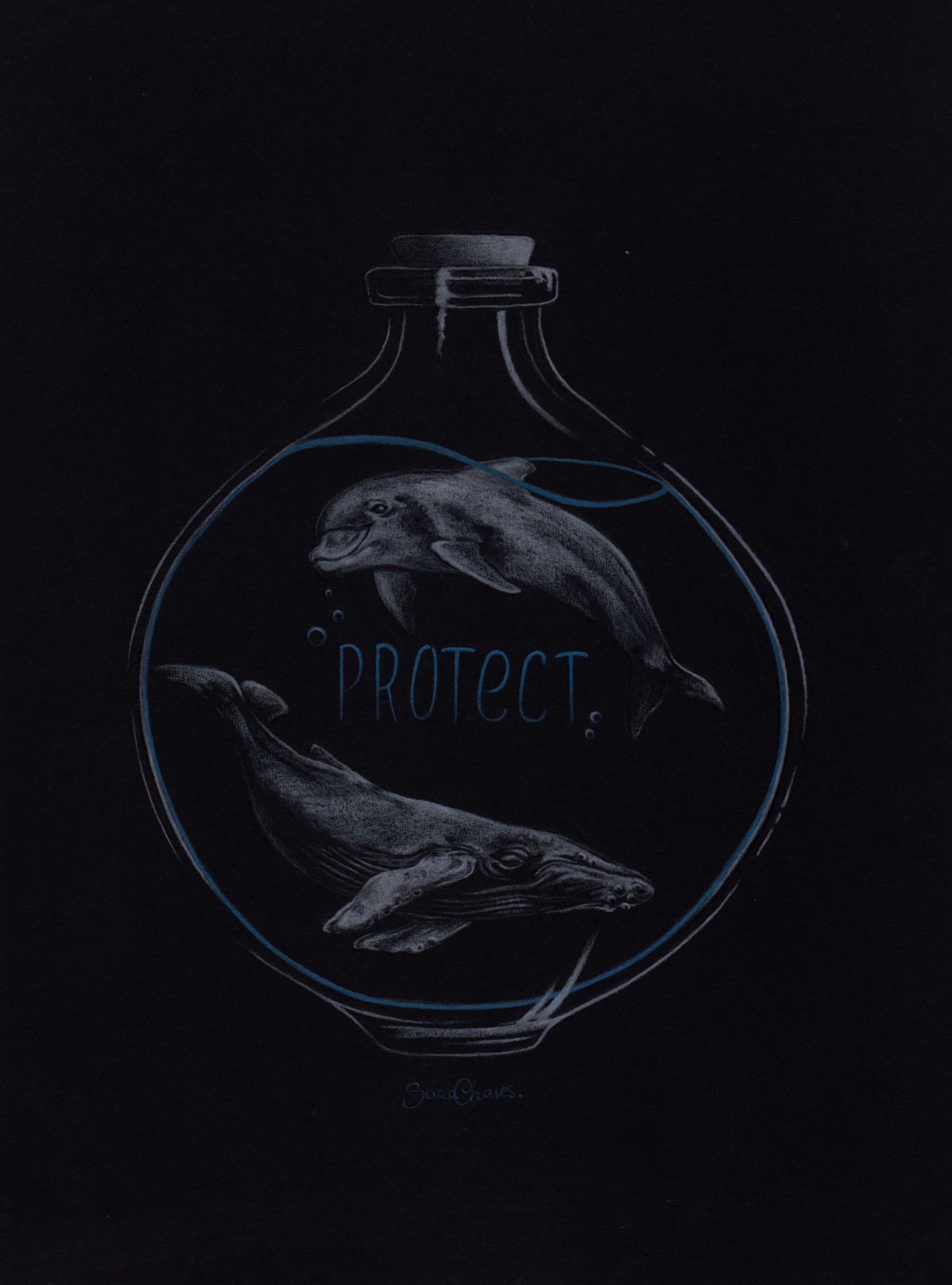 Ilustração de golfinho e baleia num frasco com a palavra PROTECT